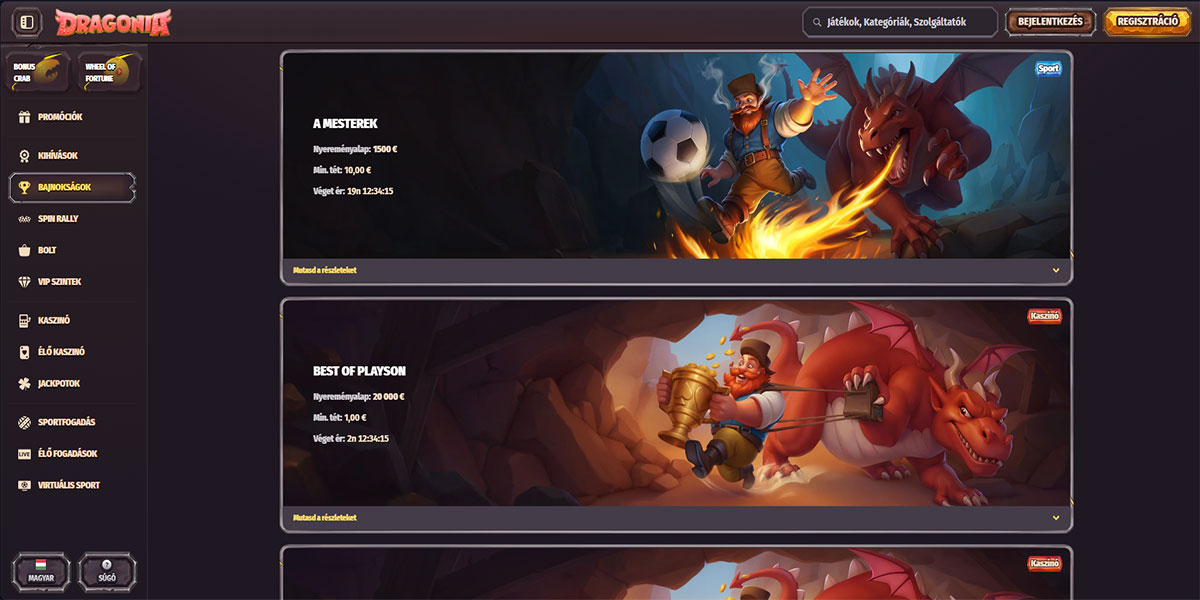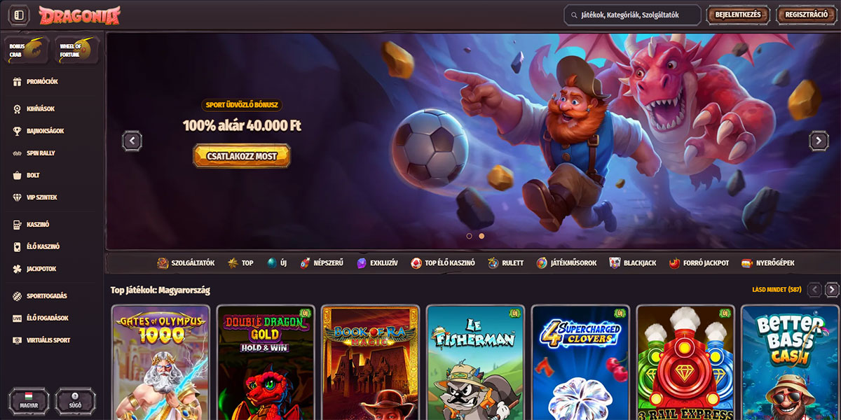A Dragonia Casino egy sárkány témájú nemzetközi online kaszinó, amely 2025-ben lépett a piacra, üzemeltetője a NovaForge LTD, amely anjouani játékengedéllyel (ALSI-152406028-FI2) rendelkezik, és fogadja a magyarországi játékosokat. A platform hatalmas játékkönyvtárral büszkélkedhet, több mint 12 000 játékkal több mint 110 szoftverszolgáltatótól, lefedve mindent az online nyerőgépektől és progresszív jackpotoktól az élő osztós asztalokig és egy integrált sportfogadási részlegig. A magyar játékosok szerény minimális befizetéssel kezdhetnek, választhatnak a fiat és kriptovaluta fizetési módok széles skálájából, és alkalmazás telepítése nélkül, egy reszponzív mobilböngészőn keresztül élvezhetik a teljes kaszinó élményt. Mindezzel a Dragonia Casino erős versenyzővé válik a magyarok számára, akik egy tartalmas, modern szerencsejáték-platformot keresnek.