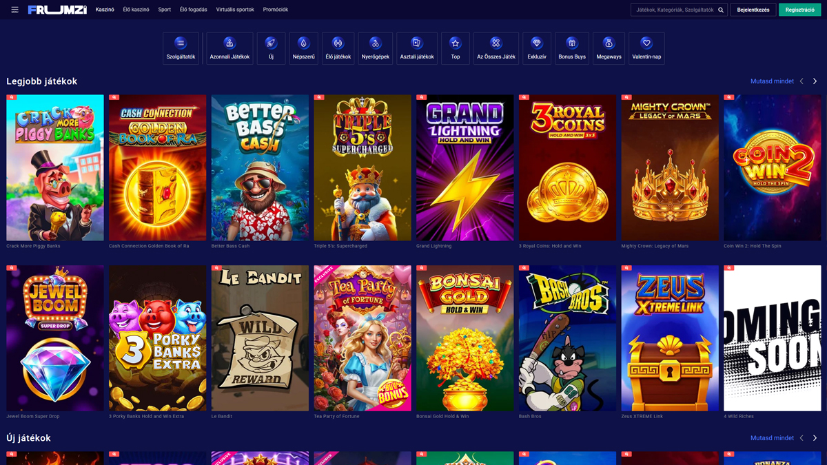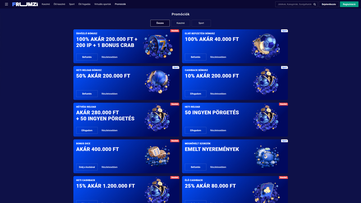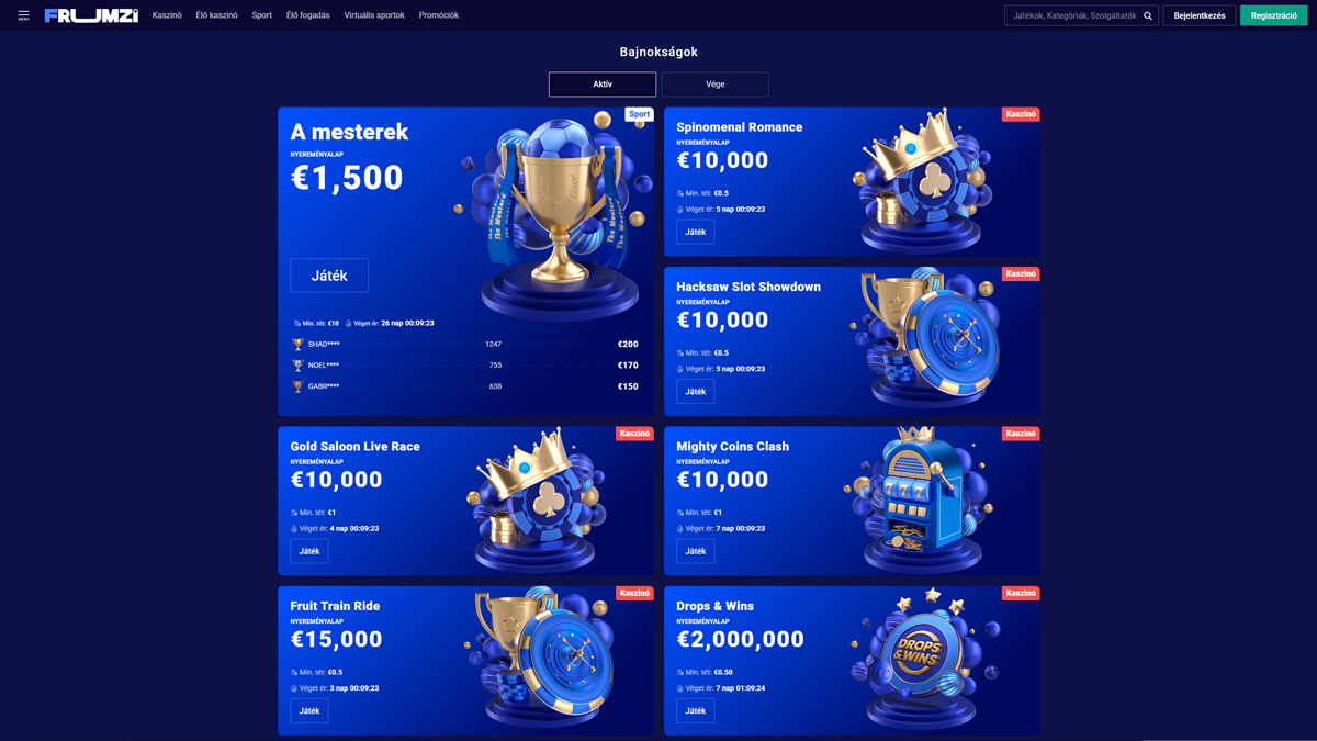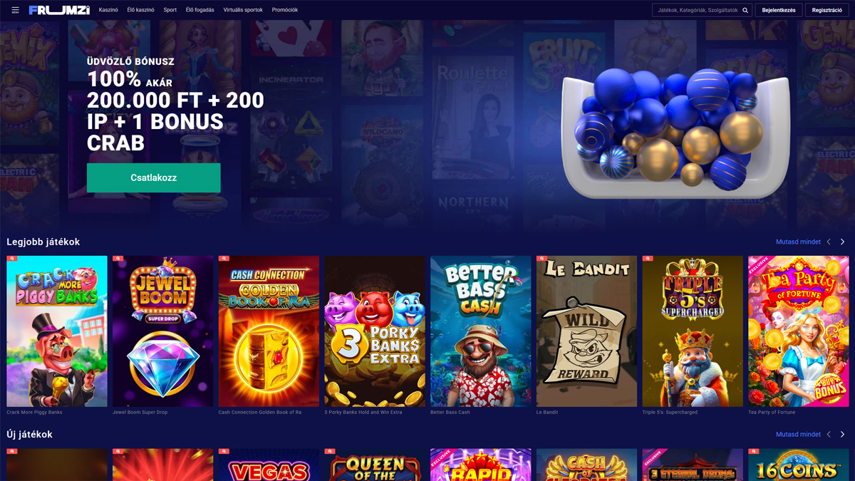 A Frumzi Casino egy funkciókban gazdag online kaszinó és sportfogadási oldal, amely ötvözi a színes, modern dizájnt a hatalmas játékválasztékkal és rugalmas játéklehetőségekkel. A 2020-ban indult platform több mint 12 000 nyerőgépes játékot, 350+ élő osztós játékot és egy integrált sportfogadási oldalt kínál, mindezt egyetlen fiókon keresztül elérhetővé téve. Mobilra optimalizált böngészős játékkal, alacsony minimális befizetéssel és a Pay & Play támogatásával a Frumzi célja, hogy gördülékeny és lebilincselő élményt nyújtson azoknak a játékosoknak, akik értékelik a változatosságot, a kényelmet és a következetes játékmenetet.