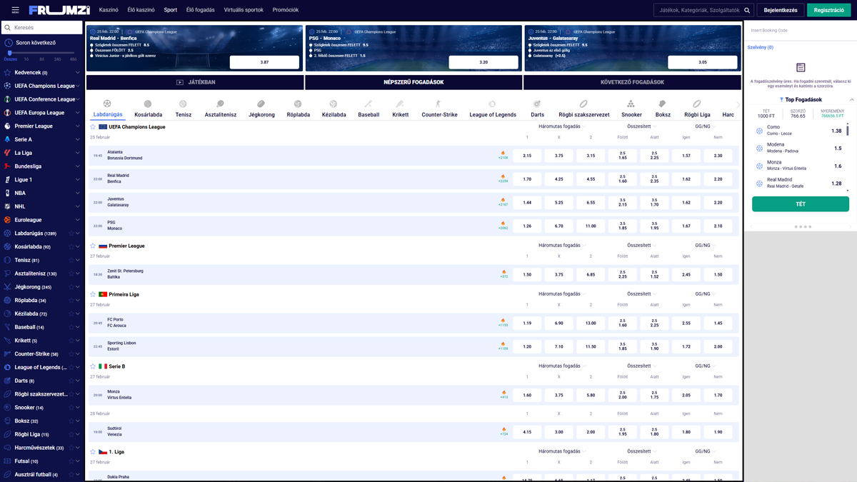 - Integrált sportfogadási oldal élő és premérkőzés fogadásokhoz.