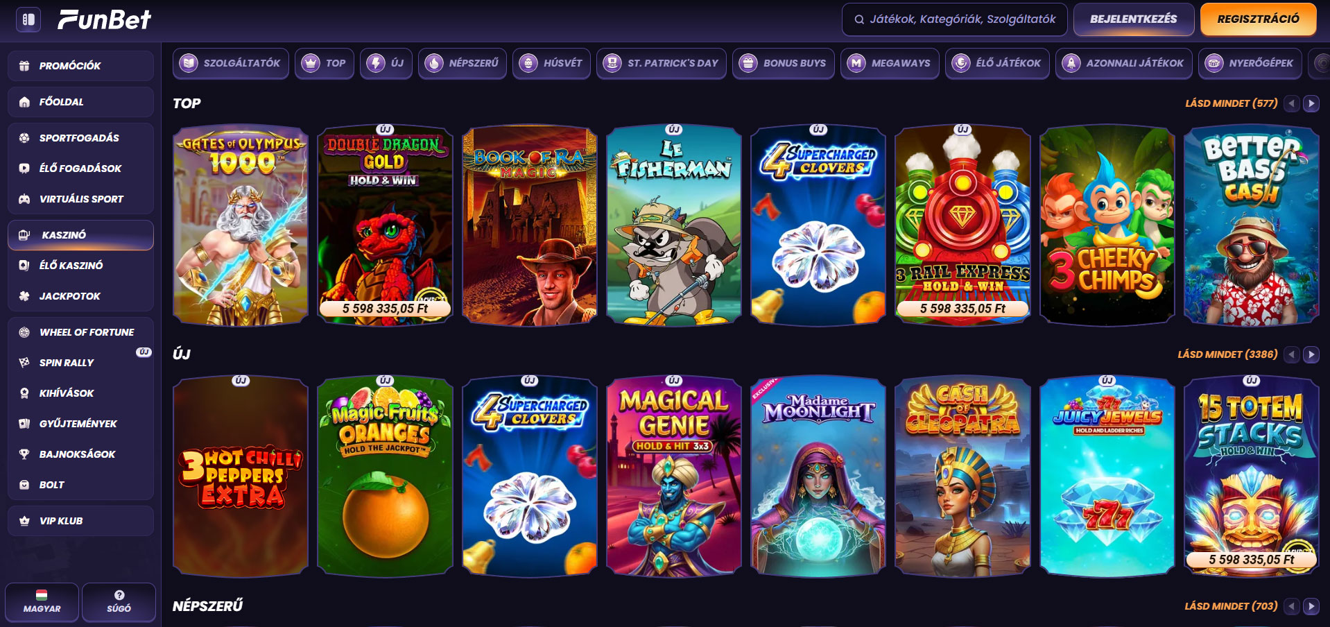 A magyar játékosok hozzáférhetnek az online nyerőgépek, klasszikus asztali játékok, jackpotok, azonnali játékok és egy átfogó, valódi osztókat felvonultató élő kaszinó szekció nagy portfóliójához.