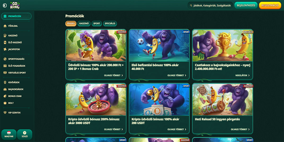 A GoKong Kaszinó egy online játékplatform, amely gyorsan növekedett, különösen a kanadai játékosok körében, indítása óta. Érvényes szerencsejáték-engedéllyel működik, és széles körű banki lehetőségeket támogat, beleértve a hagyományos módszereket és a kriptovalutákat. Az oldal széles játékkönyvtárral rendelkezik, amelyet számos jól ismert szoftverfejlesztő hajt, több mint 10 000 címmel, beleértve videó slotokat, klasszikus slotokat, asztali játékokat és egy kiterjedt live dealer részt több száz élő asztallal. A GoKong rendszeres bónuszokat és promóciókat is kínál, például üdvözlő bónuszokat és újratöltési ajánlatokat, valamint egy többszintű VIP programot, amely gyakori játékosokat jutalmaz olyan előnyökkel, mint magasabb kifizetési limit és visszatérítési előnyök.