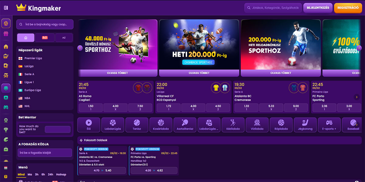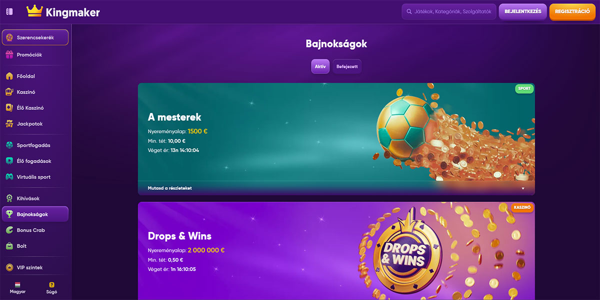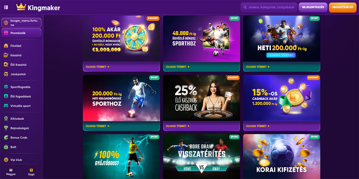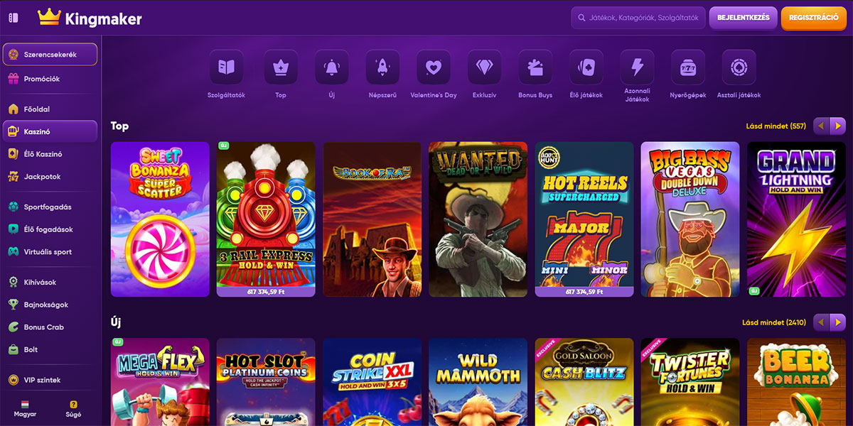 A Kingmaker Kaszinó egy online szerencsejáték platform, amely a változatosságot, a teljesítményt és a világos struktúrát értékelő játékosok számára készült. A kaszinó széles játékkönyvtárral rendelkezik, amely több ezer címből áll jól ismert szoftverfejlesztőktől, beleértve a nyerőgépeket, asztali játékokat és egy erős élő kaszinó részt igazi krupiékkal. A navigáció intuitív mind asztali, mind mobil eszközökön, lehetővé téve a játékosok számára, hogy gyorsan hozzáférjenek a játékokhoz, promóciókhoz és fiók eszközökhöz. A platform több fizetési módot támogat, beleértve a hagyományos opciókat és a kriptovalutákat, így a befizetések és a kifizetések rugalmasak a felhasználók széles köre számára.