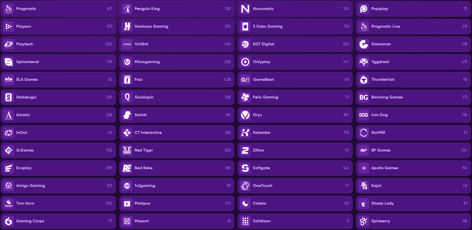 Nagy nemzetközi stúdiók, mint például a Pragmatic Play, Playtech, Microgaming, NetEnt és Hacksaw Gaming adják a katalógus nagy részét, további specializált fejlesztők támogatásával.