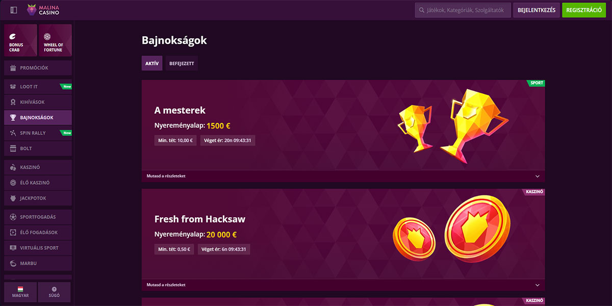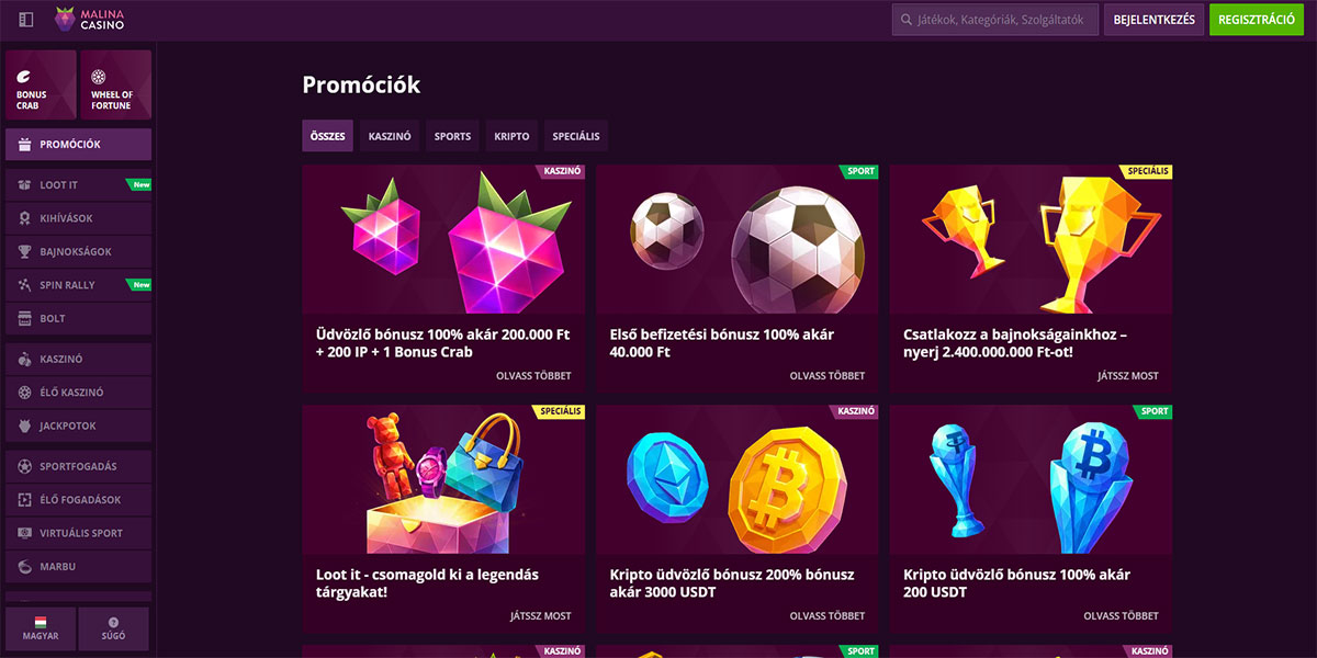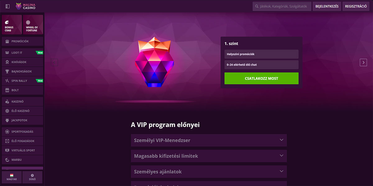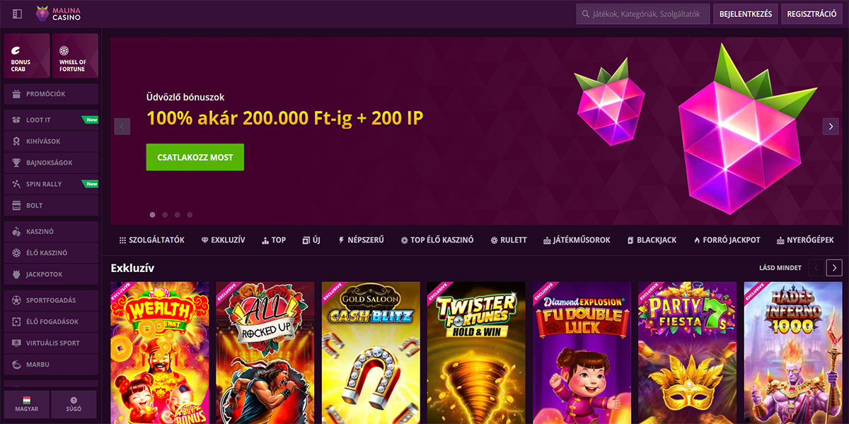 A Malina Kaszinó a Casolinia Group alatt működik és az iGate játékplatformon fut, amely a sebességre, stabilitásra és zökkenőmentes játékélményre épül. A platform üdvözli a magyar játékosokat és egy helyen kombinálja a széles kaszinó részt egy teljes sportfogadási szolgáltatással. A kaszinópadló főleg a változatosságra összpontosít. A játékosok több mint 10 000 címből álló, kiterjedt slot katalógushoz férnek hozzá, valamint több mint 500 élő kereskedős asztalhoz, amely klasszikus és modern formátumokat is lefed. A slotok, élő játékok és sportfogadás egymás mellett helyezkedik el, egy kiegyensúlyozott platformot teremtve, amely azoknak a felhasználóknak felel meg, akik több fogadási lehetőséget részesítenek előnyben anélkül, hogy webhelyet váltanának.
