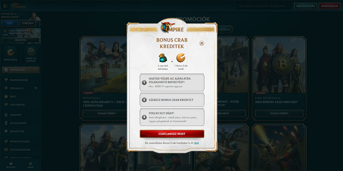 A MyEmpire Casinoban a minimális befizetés általában alacsony, lehetővé téve a magyar játékosok számára, hogy szerény összeggel kezdjenek játszani, bár a pontos limitek fizetési mód szerint változhatnak (10 eur-tól 20 eur-ig).