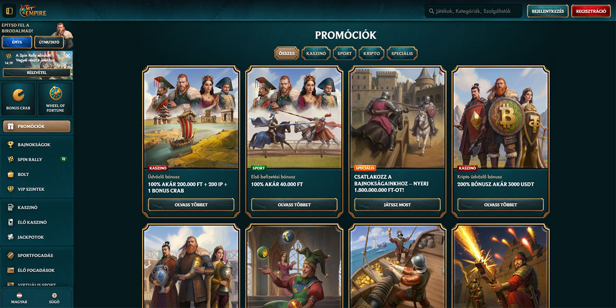 A MyEmpire Kaszinó egy nemzetközi online kaszinó, amely 2023-ban indult, Anjouan engedély (Antillephone N.V. 8048/JAZ) alatt működik, és magyar játékosokat fogad. A platform több ezer kaszinójátékot kínál, erős hangsúlyt fektetve az online nyerőgépekre és az élő kereskedős játékokra, valamint sportfogadásra is, ahol ez elérhető. A magyar játékosok alacsony minimális befizetéssel kezdhetnek, választhatnak a rugalmas nemzetközi és kriptó fizetési módok közül, és élvezhetik a mobilra optimalizált játékélményt alkalmazás letöltése nélkül, ami a MyEmpire Casinót ideális választássá teszi azok számára, akik nagy, mindent magában foglaló online kaszinót keresnek Magyarországon.
