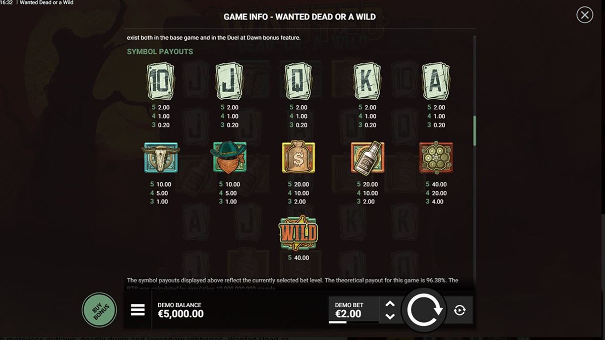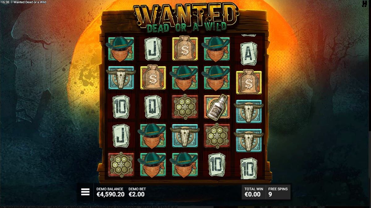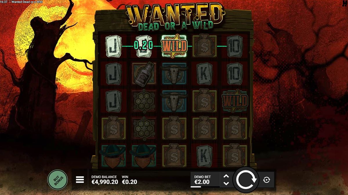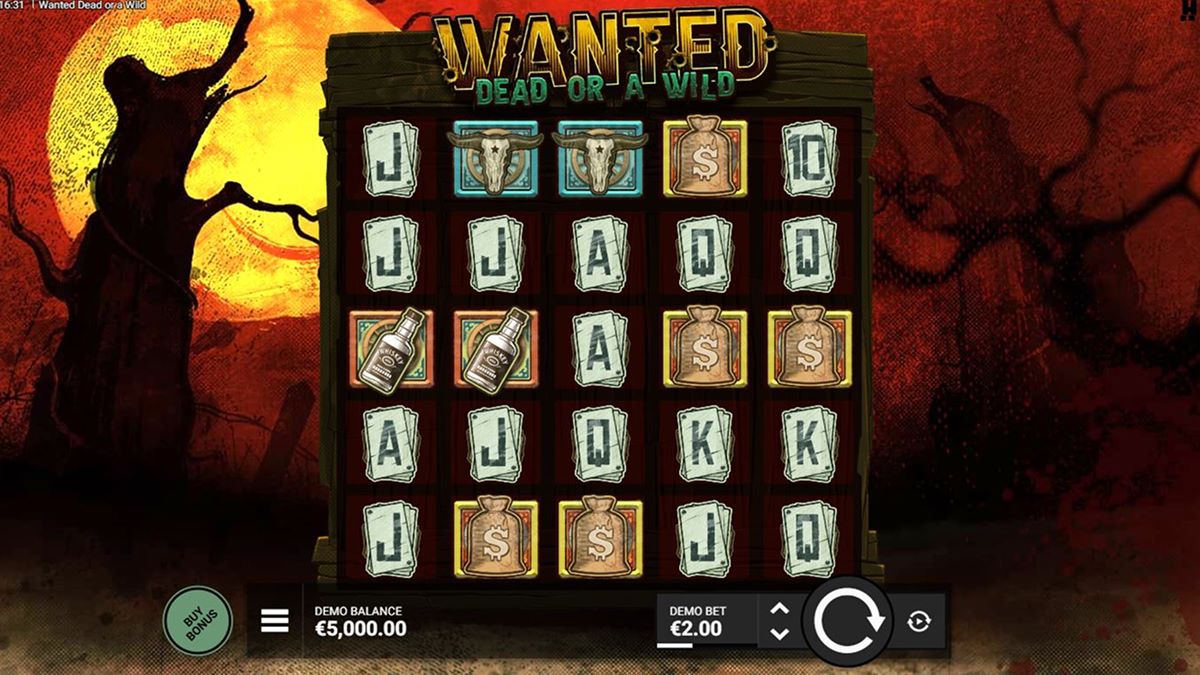 A játék hagyományos 5×5-ös elrendezést használ 15 fizetési vonallal, ahol a nyereményeket balról jobbra egyező szimbólumok alkotják. Ellentétben sok modern nyerőgéppel, amelyek az alapjáték folyamatos visszacsatolására támaszkodnak, a Wanted Dead or a Wild szándékosan visszafogott alapjátékkal rendelkezik. A nyeremények ritkábban jelennek meg, ami a 19,36-os találati gyakoriságát tükrözi, de ez a tervezési választás növeli a funkciók aktiválásának hatását.
