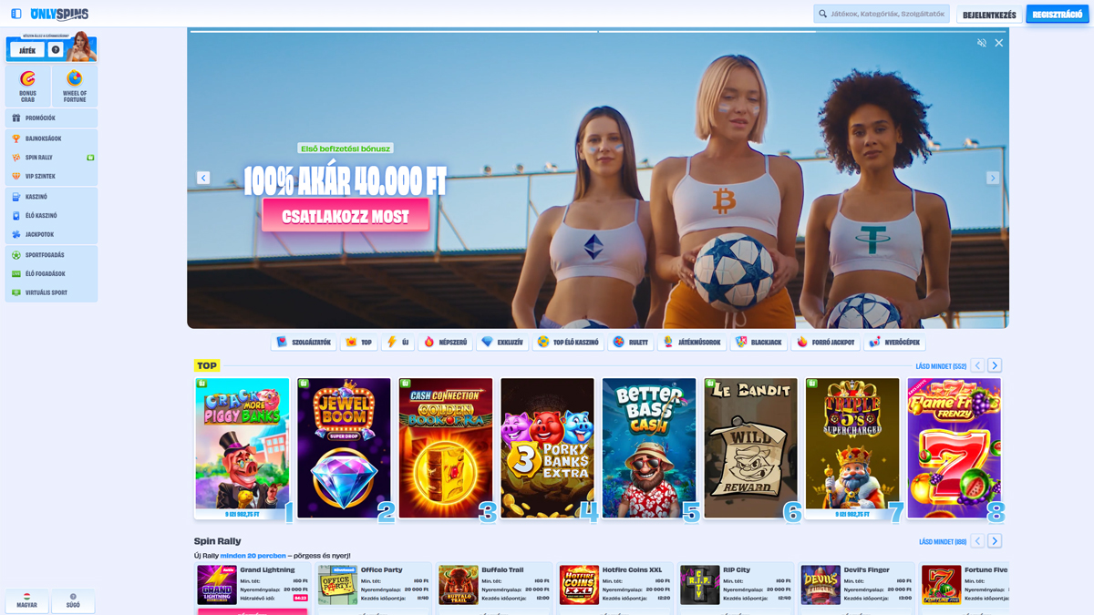 Az OnlySpins Casino egy friss, nemzetközi online kaszinó, amely 2025-ben indult, a Tobique Gaming Commission licencével (Dreamline Ventures SRL) működik, és szívesen látja a magyar játékosokat is. A platform több mint 13 000 kaszinójáték hatalmas gyűjteményét kínálja, különösen erős a videó nyerőgépek és az élő kaszinó szórakoztatás terén, emellett integrált sportfogadási lehetőségekkel is rendelkezik. A magyar játékosok számára elérhetőek az alacsony minimális befizetések, a sokféle fizetési mód, beleértve a kriptovalutákat is, valamint egy teljesen reszponzív mobiloldal, amely zökkenőmentes játékélményt biztosít minden eszközön. Ez az OnlySpins Casino-t vonzó célponttá teszi a változatosságra és modern szerencsejáték-funkciókra vágyó magyarok számára.