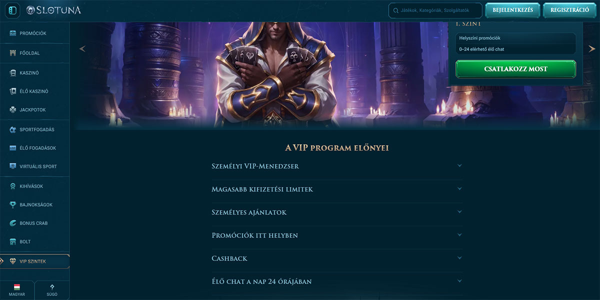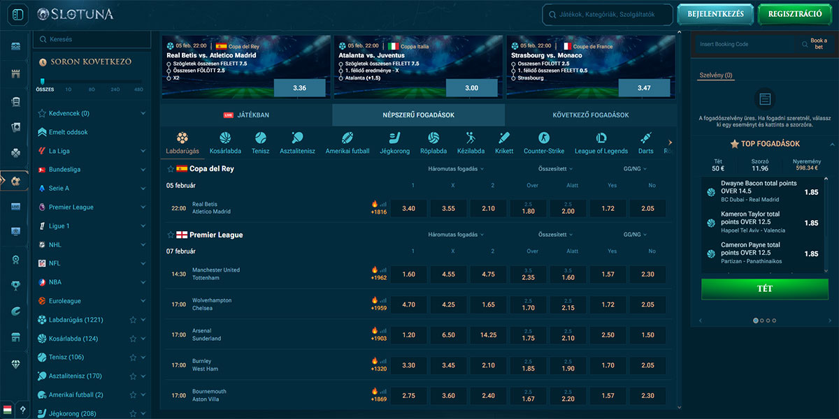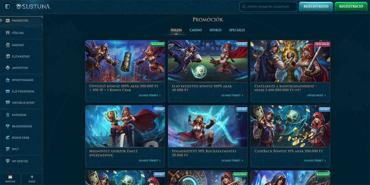 A Slotuna Kaszinó 2024-ben indult, és egy modern online kaszinó és sportfogadó platformként mutatkozik be, amelyet az egyszerűség és a játékélmény szem előtt tartásával terveztek. A platform egy széles kaszinó kínálatot ötvöz – beleértve a slotokat, asztali játékokat, live dealer játékokat és jackpotokat – egy integrált sportfogadó szekcióval, amely hagyományos sportpiacokat, élő fogadást és virtuális sportokat kínál. A Slotuna a letisztult designra, a reszponzív navigációra és a funkciókban gazdag elrendezésre helyezi a hangsúlyt, amely a kaszinó szórakozást és a sportfogadást egyaránt kereső játékosok számára ideális.