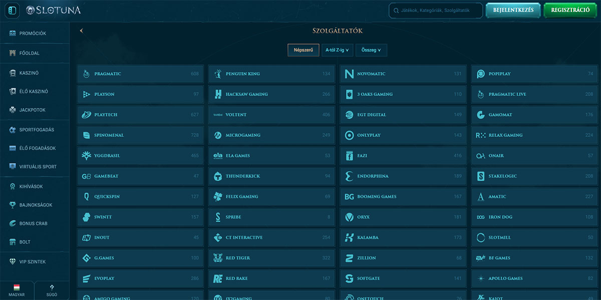 - Széles játékkatalógus, amely slotokat, live játékokat és jackpotokat foglal magában.