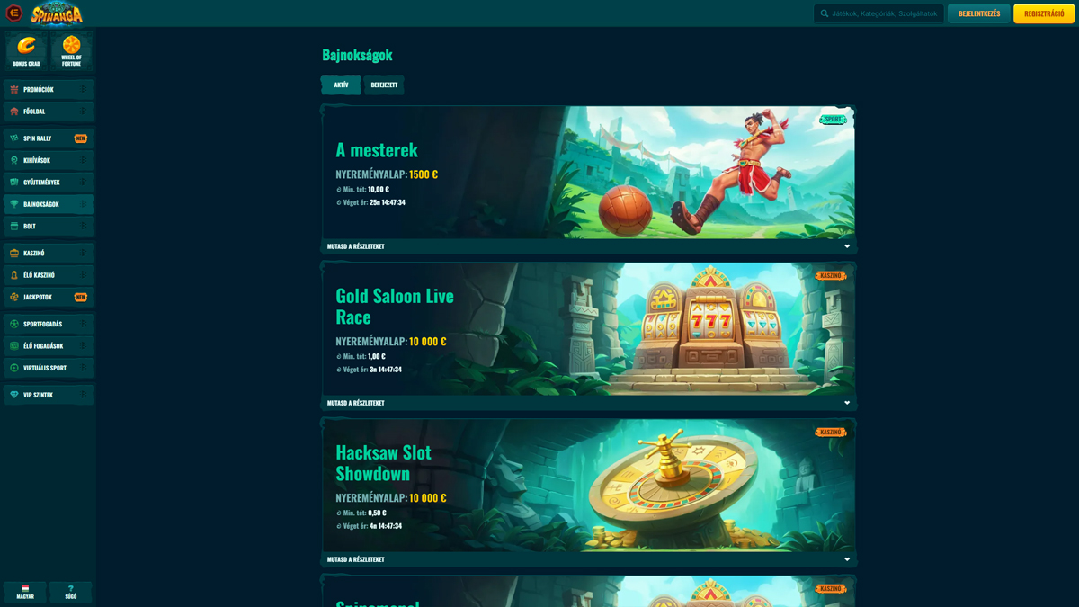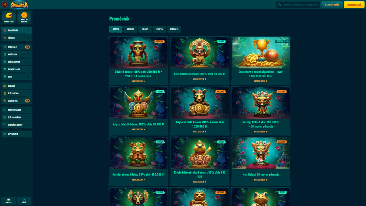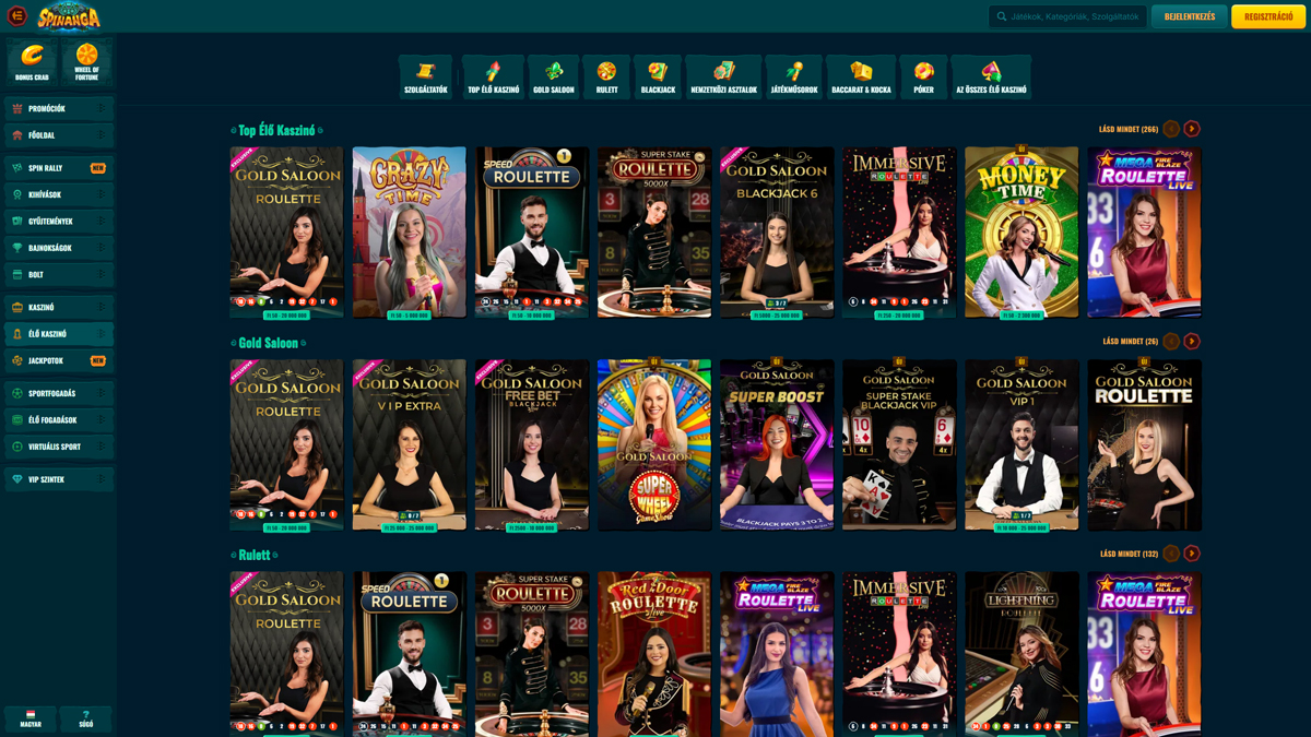 A Spinanga Casino magyar játékosai a kaszinójátékok széles skálájára számíthatnak, erős fókuszban az online nyerőgépekkel, beleértve a klasszikus nyerőgépeket, a modern video slotokat és a jackpot játékokat ismert szolgáltatóktól. A platform emellett egy átfogó élő kaszinó szekcióval is rendelkezik, amely valódi osztós rulettet, blackjacket, baccaratot, póker variációkat és népszerű játékshow asztalokat kínál valós időben közvetítve. Ezenkívül a Spinanga a támogatott régiókban egy sportfogadási szekciót is tartalmaz, amely olyan piacokra fed le, mint a futball, kosárlabda, tenisz, eSportok és még sok más, mind élő, mind esemény előtti fogadási lehetőségekkel.