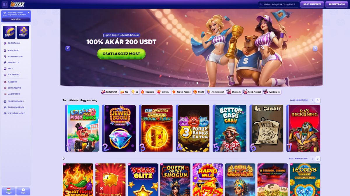 A Spinbara Casino egy 2025-ben indult modern online játékplatform, amely hatalmas kaszinókínálatot ötvöz a sportfogadással és az élő osztós játékokkal. Az oldal egy bőkezű üdvözlő bónuszcsomagot kínál, valamint folyamatos promóciókat, tornákat és egyedi funkciókat, amelyek célja a rendszeres játék jutalmazása. A Spinbara játékportfóliója több ezer nyerőgépet, asztali játékot, főnyereményes játékot és élő kaszinó opciót foglal magában a legjobb szolgáltatóktól. A szélesebb körű fogadási élményt kereső játékosok számára sportfogadás, virtuális sportok és e-sport piacok is elérhetők. Mobilbarát kialakításával és több valuta támogatásával a Spinbara célja, hogy lebilincselő játékélményt kínáljon asztali és mobileszközökön egyaránt.