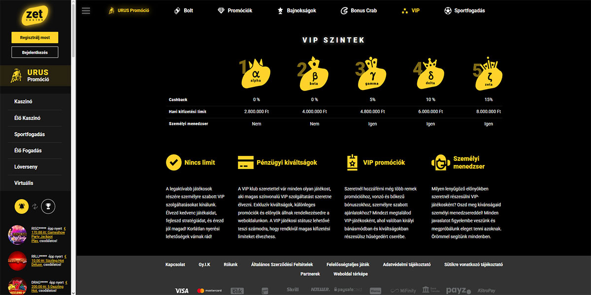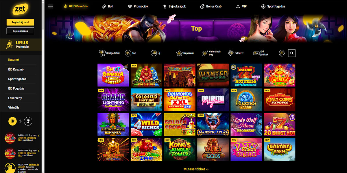 A Zet Kaszinó magas volumenű online kaszinóként pozicionálja magát, amelyet a választékra, az áttekinthető struktúrára és a böngészőalapú hozzáférésre értékelő játékosok számára építettek. A platform egyesíti a kaszinójátékokat és a sportfogadást egyetlen fiók alatt, megtartva az egyszerű navigációt és a konzisztenciát a szakaszok között. Több mint 9400 nyerőgépes játékkal és több mint 260 live kaszinóval és asztali játékkal a hangsúly egyértelműen a mennyiségen, és nem a niche funkciókon van.
